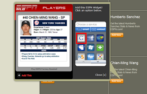 在美聯洋基球員widget頁下方可以找到#40王建民,按下Add New 彈出視窗--選G––